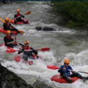 Einstiegsstelle direkt vor dem Haus, (Neoprenanzüge und Helme werden gestellt) gemeinsam gleiten wir auf den Wellen der Saalach.